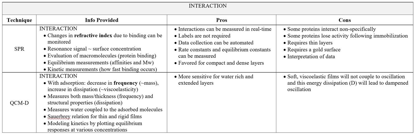 QCM-D: real-time film measurements of mass (f) and surface coverage (d), binding kinetics, substrate specificity, protein adsorption (no change in f with exposure to fibronectin)
