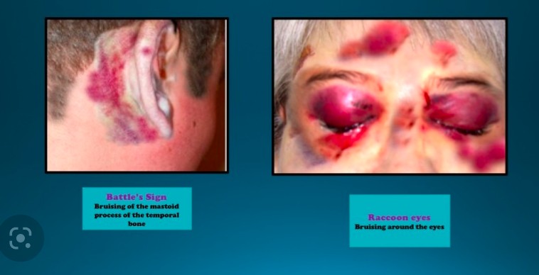 Bleeding from ruptured vessels can leak into the middle ear (haemotympanum) or mastoid area (Battle’s sign), while ruptured CSF spaces may cause fluid to leak into the nose or auditory canal (CSF rhinorrhoea and otorrhoea).