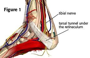 compression of the tibial nerve as it passes through the ankles under the flexor retinaculum -> burning/numbness/aching of the distal plantar surface of foot or toes +/- radiation to the calf