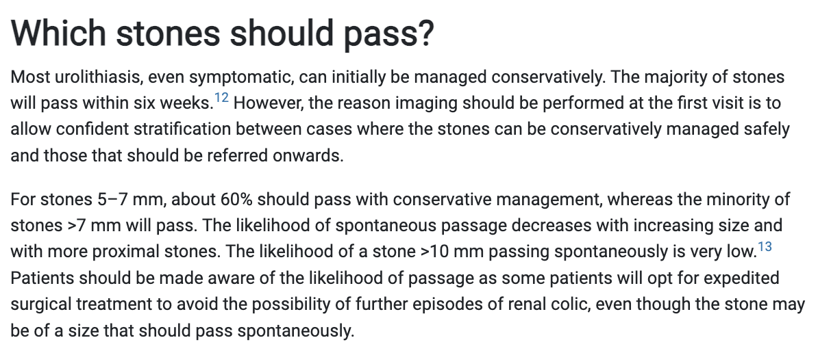 = C: The patient will require surgical intervention - A 2 cm calculus will not pass spontaneously.