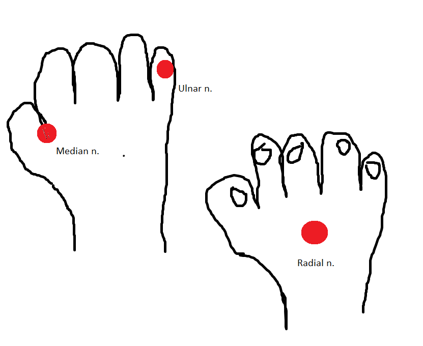 Where to test for sensation (possible neurological compromise) for medial, radial and ulnar nerve? (3)