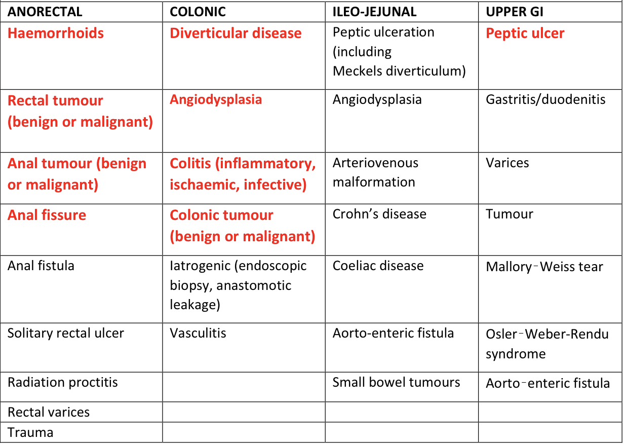 passage of blood per rectum may be associated with diarrhoea (such as with colitis) or mucus (think of colitis, proctitis, rectal cancer, and villous adenomas of the rectum). Extensive haemorrhoids may also be associated with the passage of mucus per rectum.