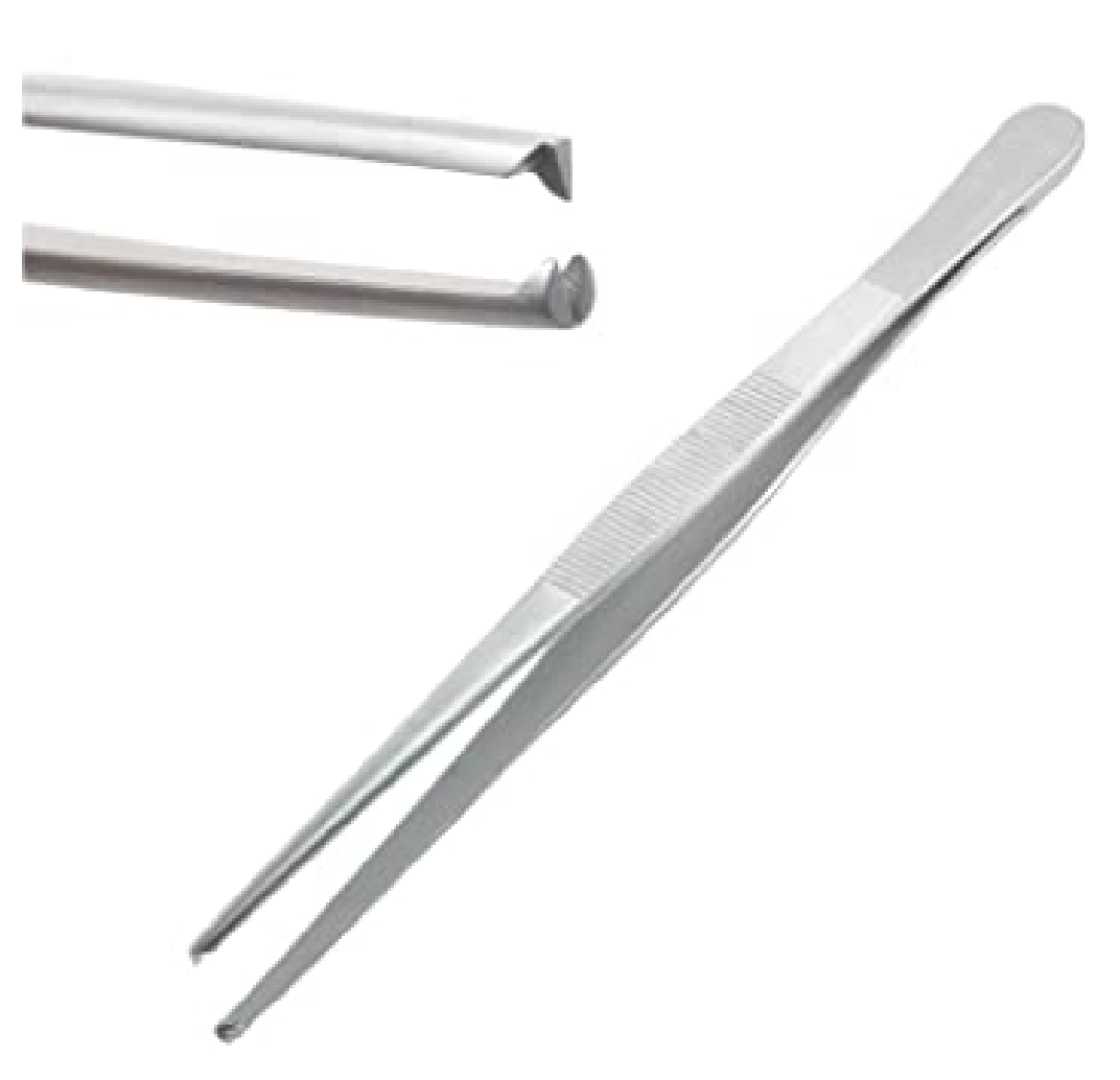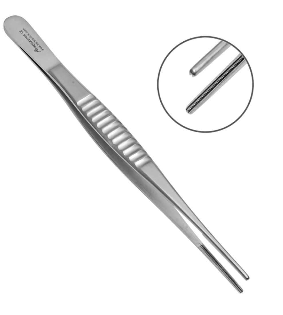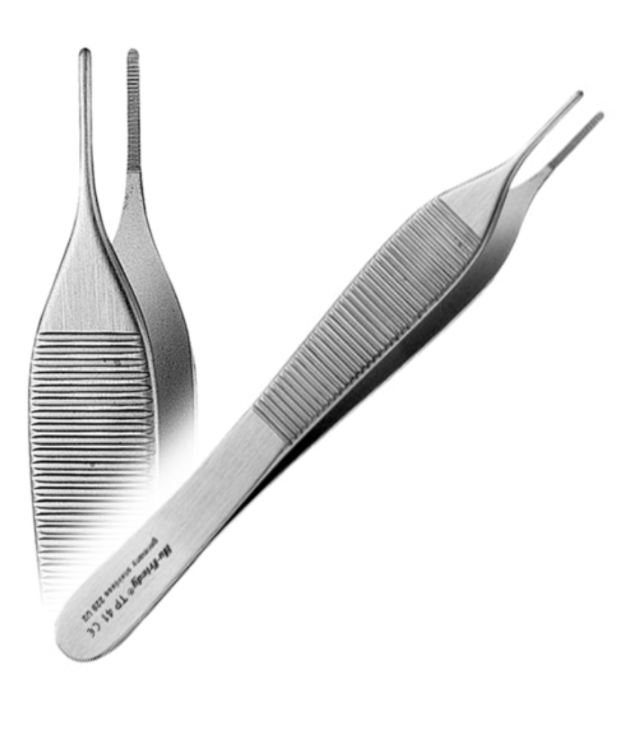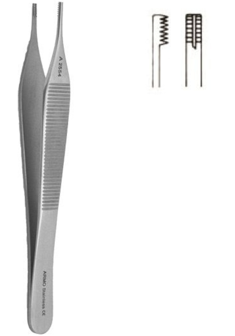 Use: - Have a very narrow tip that broadens to a side shaft - Holding/manipulating delicate tissue ◦ have flat, atraumatic serrations with no teeth ◦ used for holding dressing materials during surgery, dressing/packing wounds