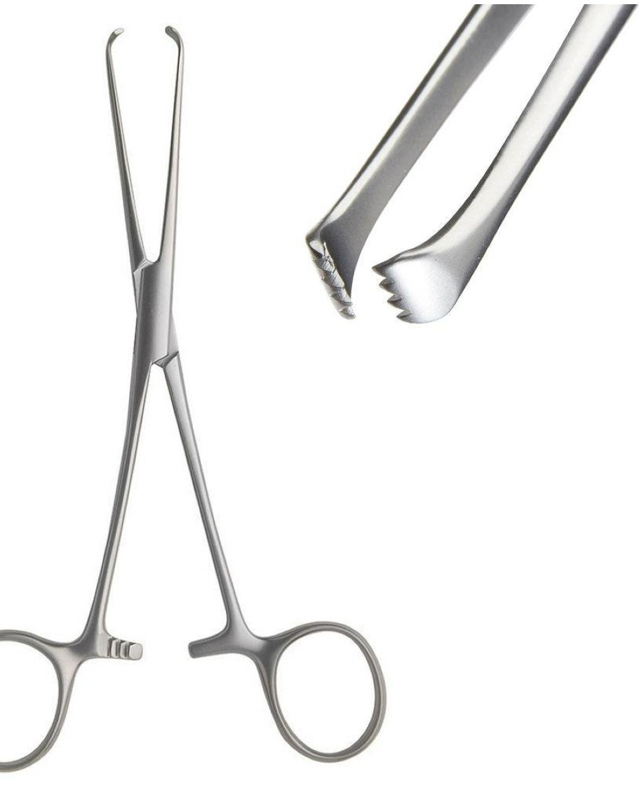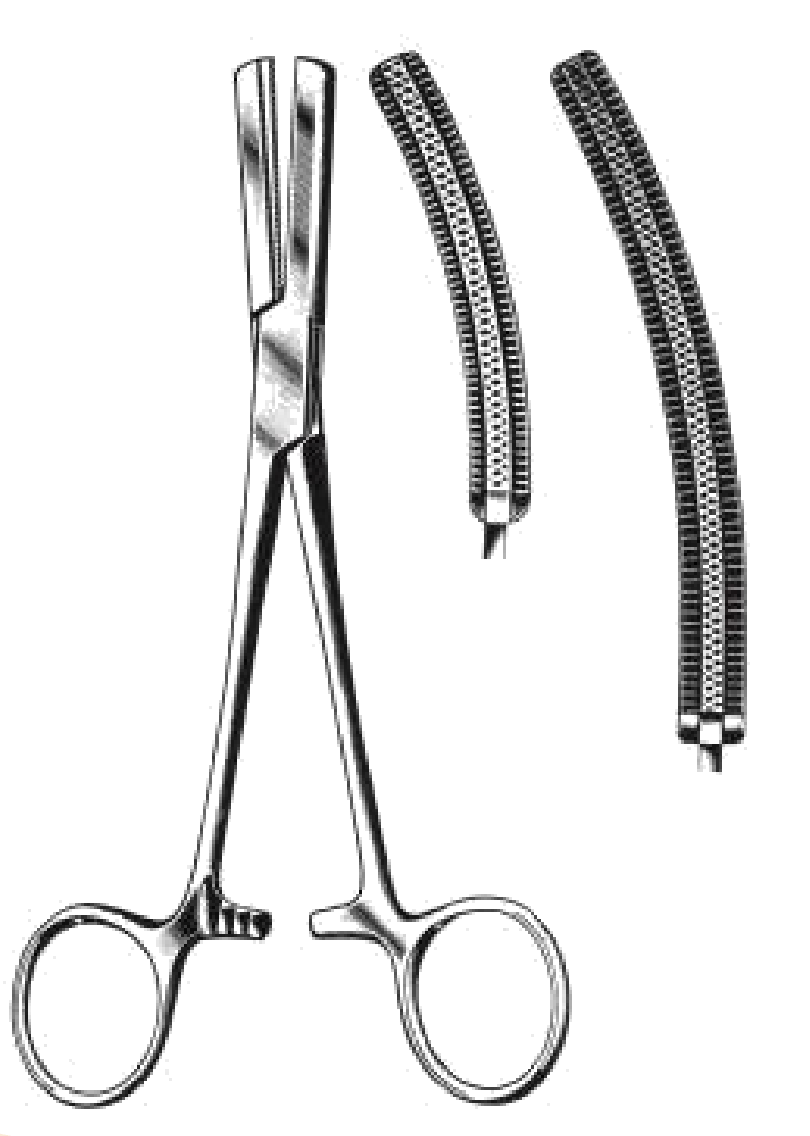 Use - Used to clamp large vessels or large tissue masses - Different from other hemostats ◦ both horizontal and vertical serrations on the jaw near the tip, giving it a checkerboard appearance, multiple male-female groves down length - Large 8” long instrument, ◦ with jaw about 3 ½” of entire length ◦ Straight or curved tips