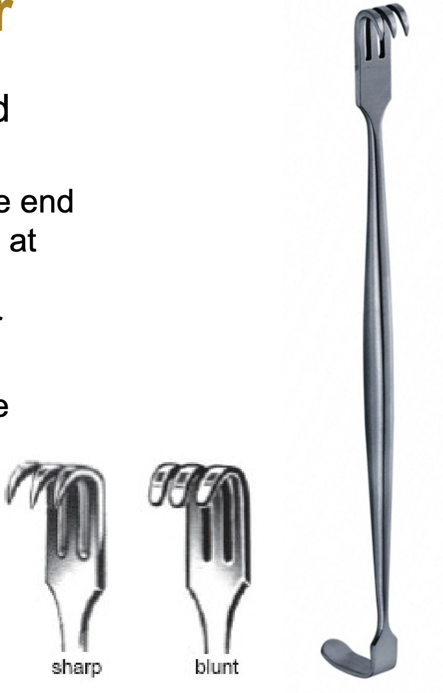 Use: - Double-ended, handheld retractor ◦ Narrow, blunt blade on one end & toothed, traumatic blade at the other end ◦ The teeth may be sharp or blunt ◦ Primarily used with surface tissue