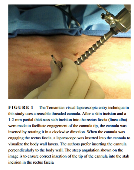 Midline entry (c.f. paramedian), Ternamian visial entry (c.f. modified Hasson and Veress needle)