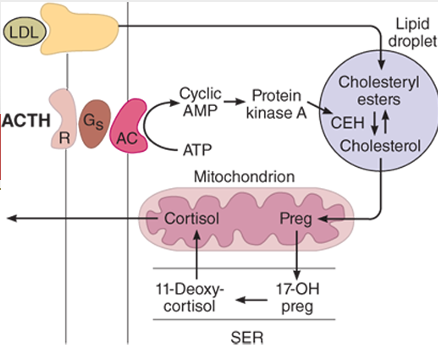 Cette étape permet d’initier la synthèse des hormones stéroïdiennes de la corticosurrénale avec la mobilisation du cholestérol à l’intérieur des mitochondries.