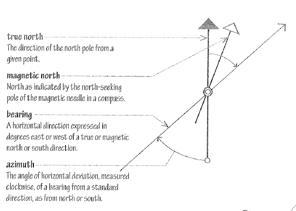 The compass direction from one reference point to the next for each leg of metes-and-bounds survey, stated in degrees, minutes, and seconds as an angular deviation east or west of due north or south.