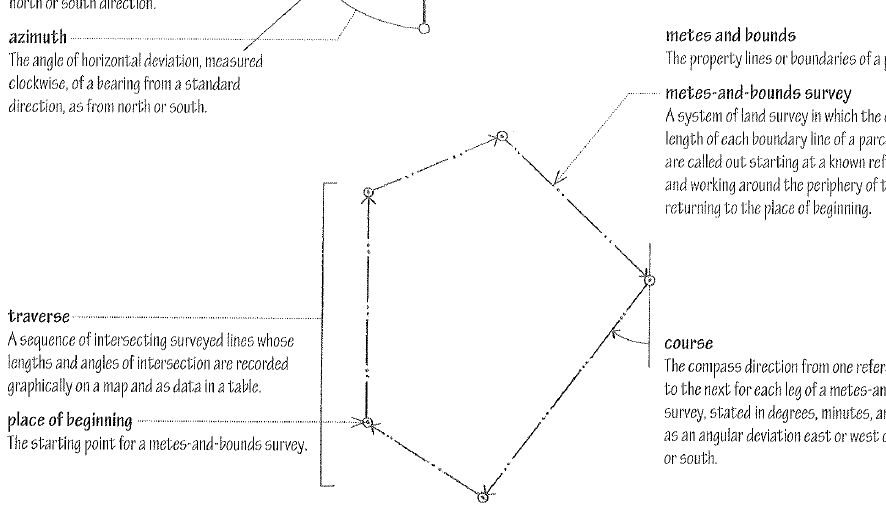 A legal term for the boundary lines of a parcel of land as used in deeds and titles.