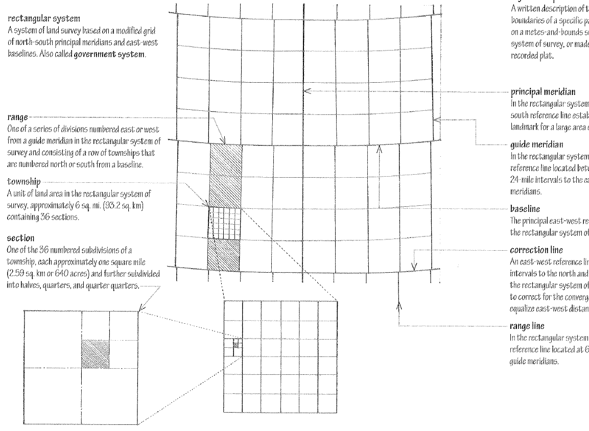 A system of land survey based on a modified grid of north-south principal meridians and east-west baselines.