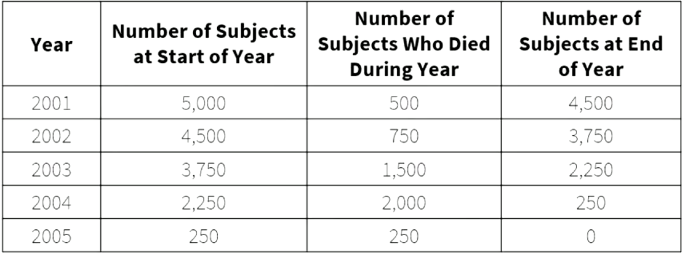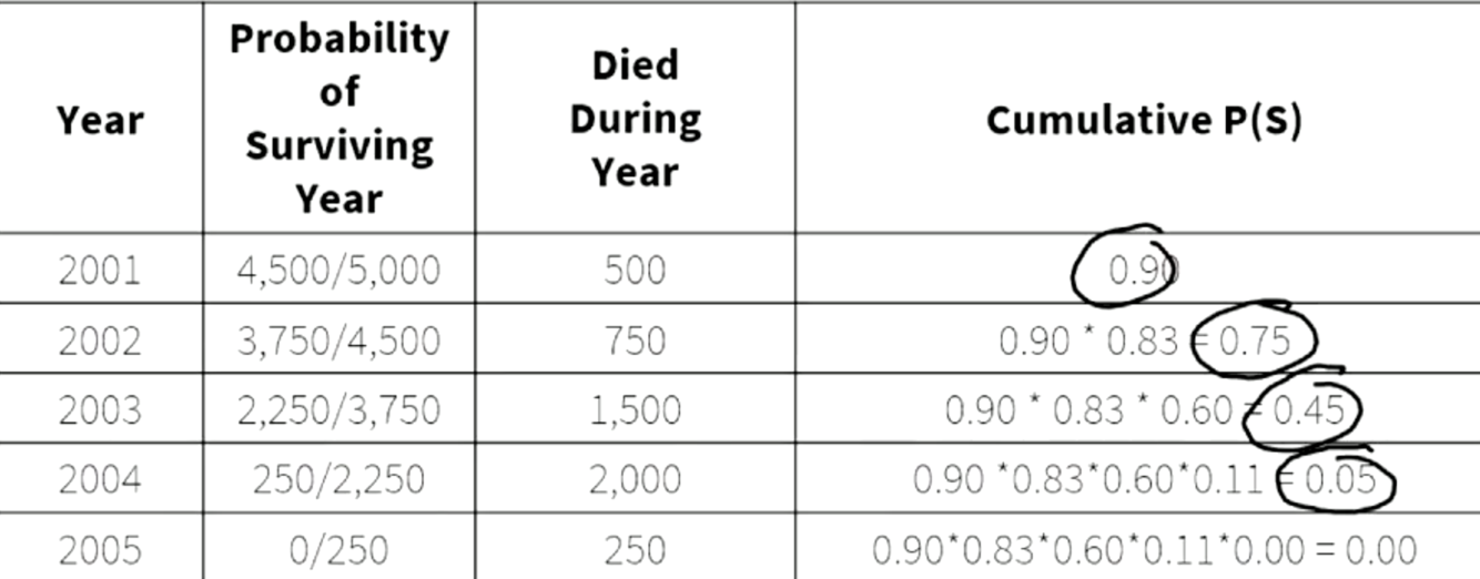 S(t)2001= 0.9: 0.9 probability of surviving through 2001
