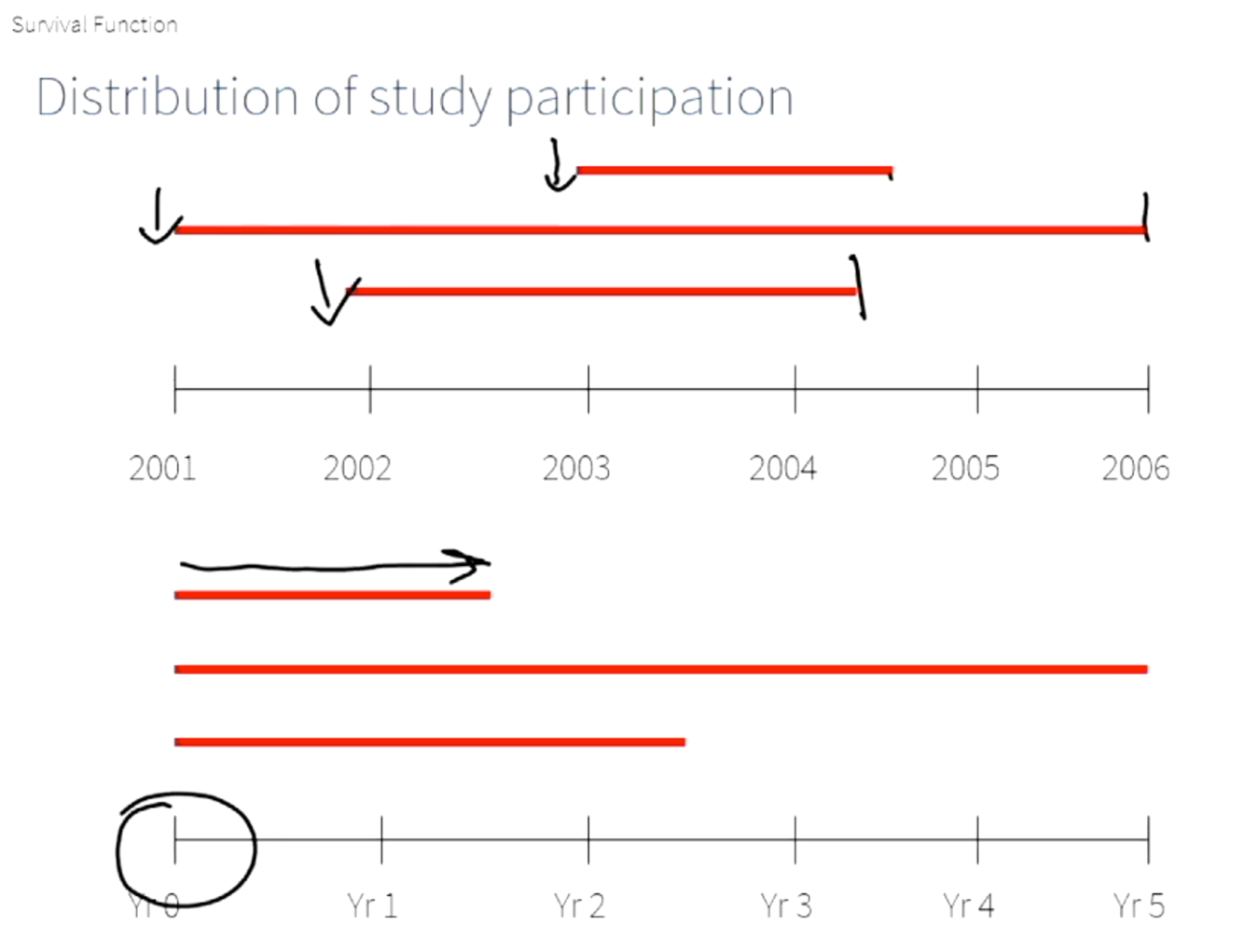 How are survival times adjusted for people entering the study late and only having for example 1 year to be followed up?