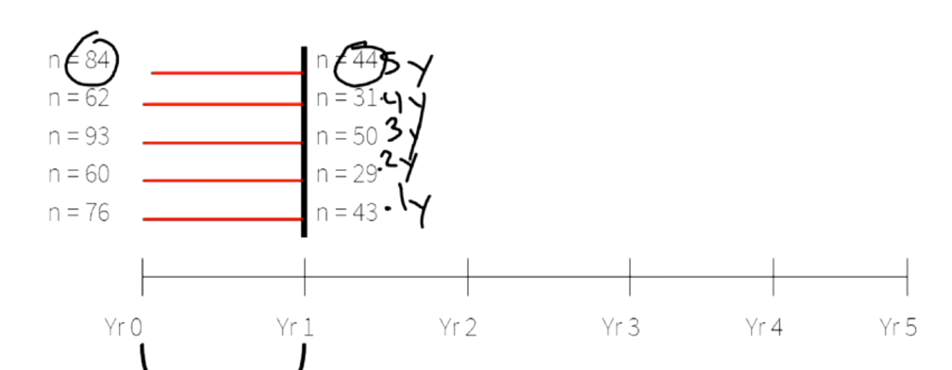 -when calculating probability of surviving past 1 year follow up, add all participants who have at least 1 year in study