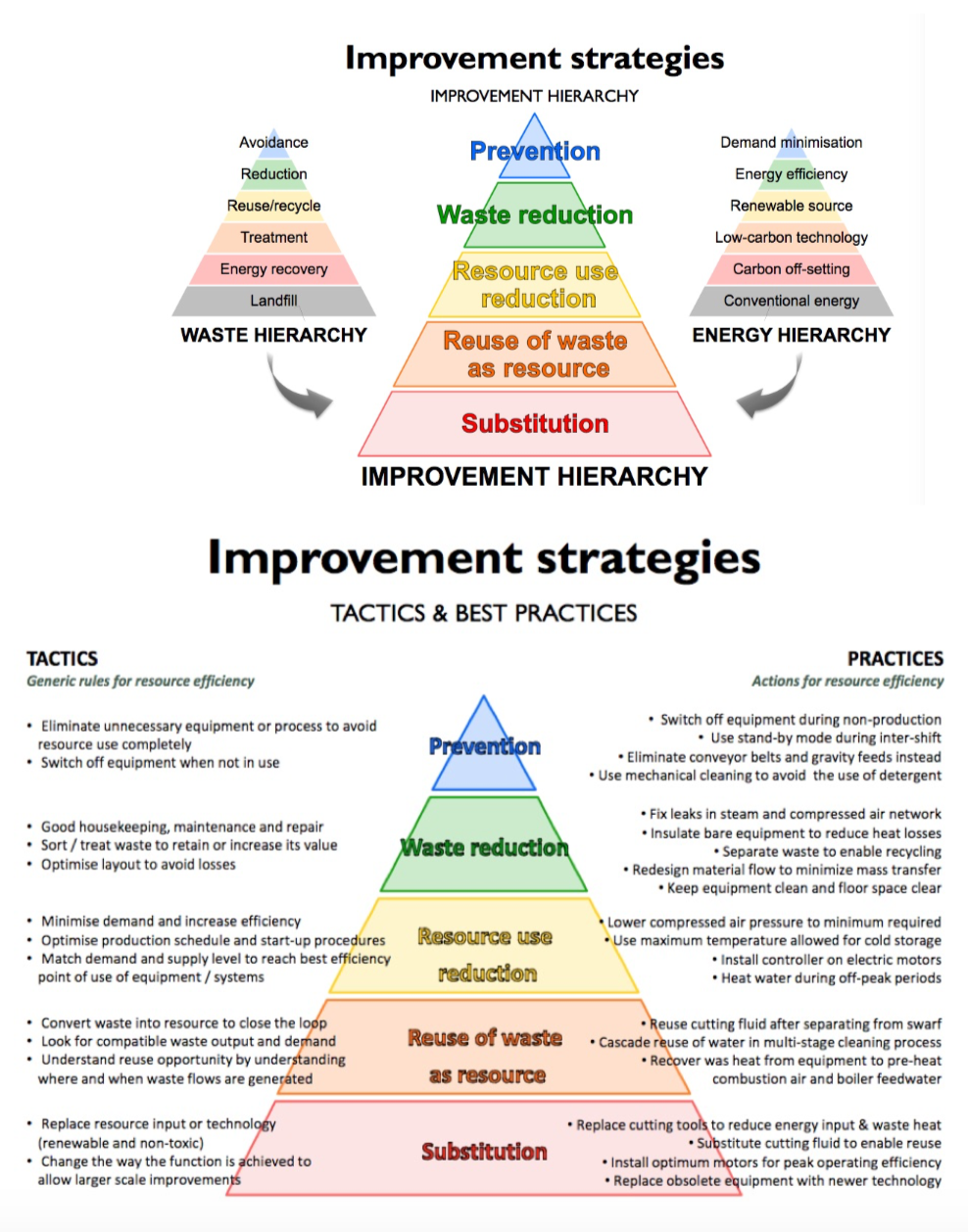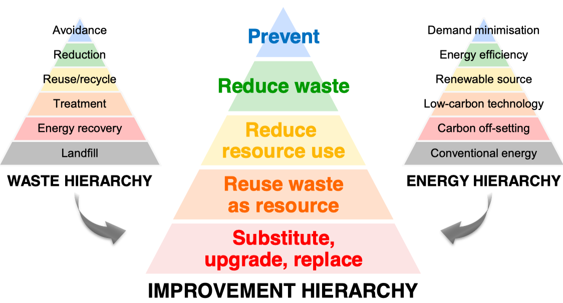 Describe the waste and energy hierarchy and how these feed into the improvement hierarchy
