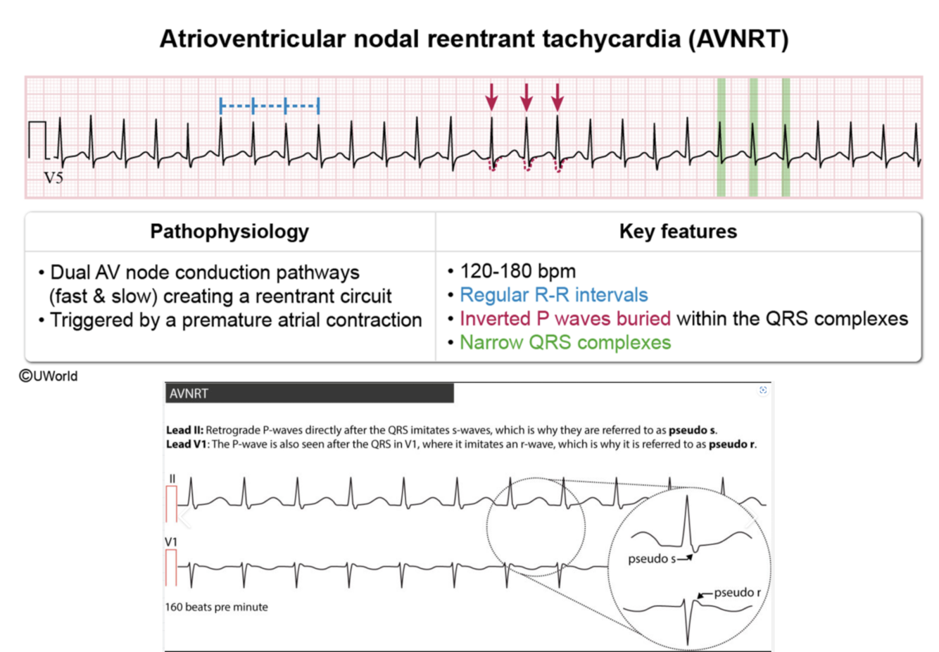 AVNRT is managed with vagal maneuvers and adenosine, while atrial fibrillation requires rate control and anticoagulation if indicated.