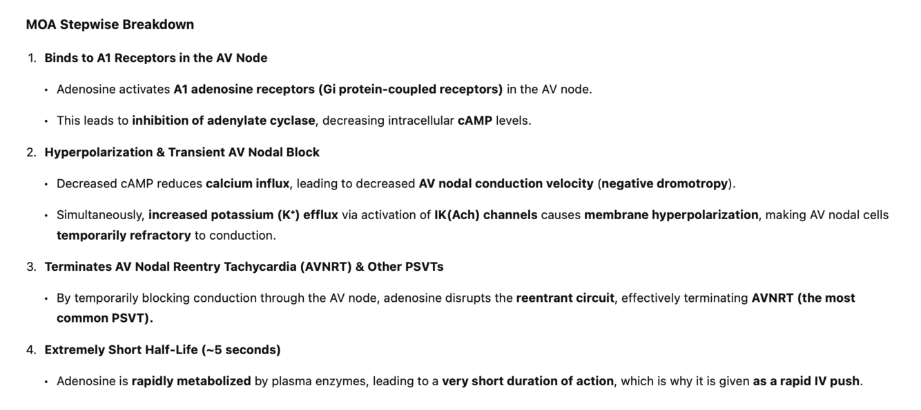 Temporarily blocks conduction, terminating AVNRT and unmasking atrial activity.