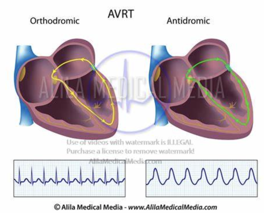 AVNRT is due to a reentrant circuit within the AV node, while AVRT involves an accessory pathway outside the AV node.