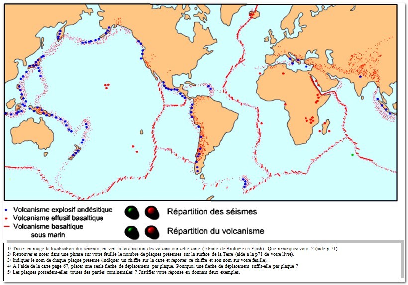 Les volcans et les séismes ne sont pas répartis au hasard sur la terre, ils sont réparti au niveau des dorsales,des fosses océanique et des chaînes de montagnes.