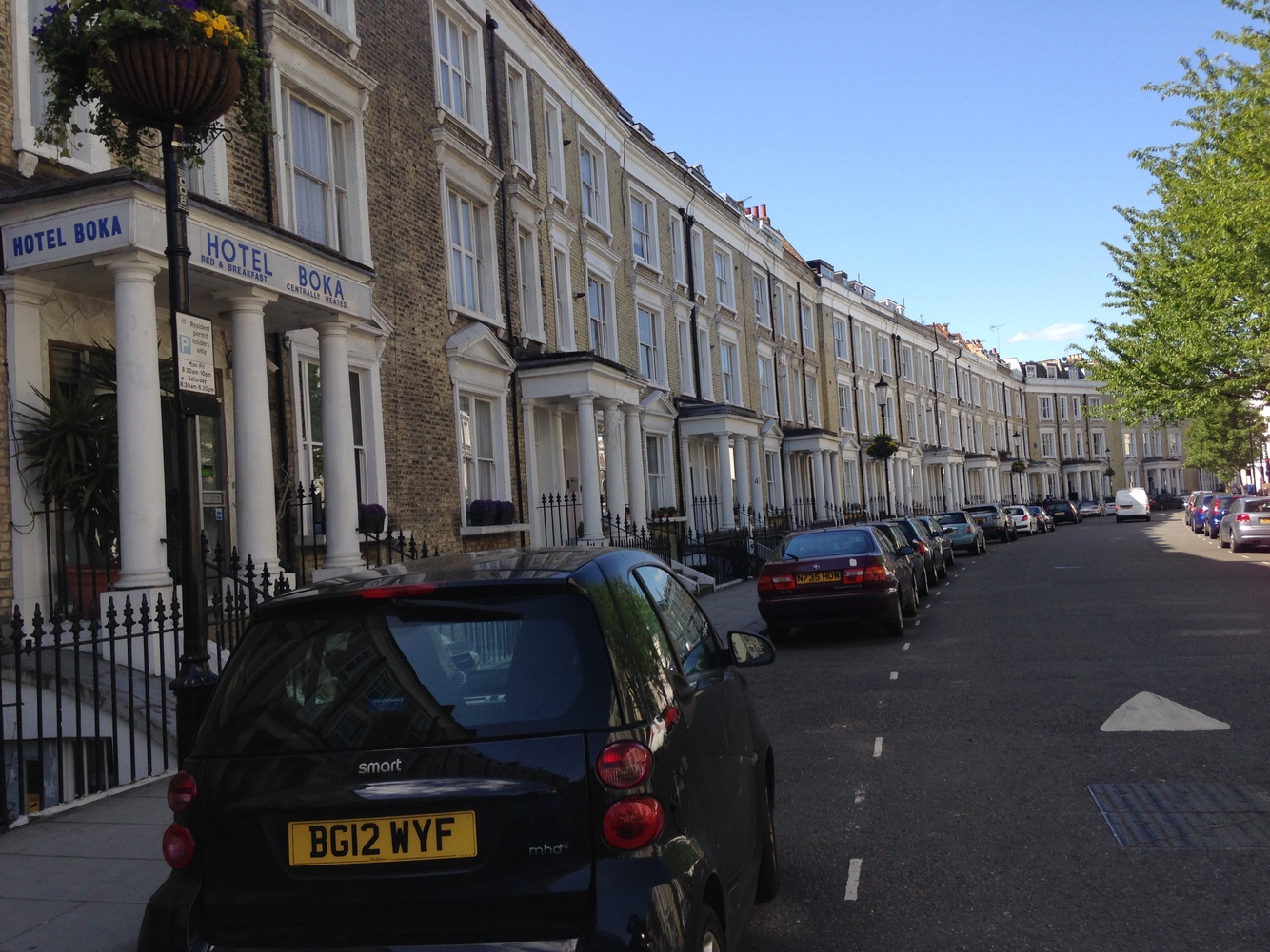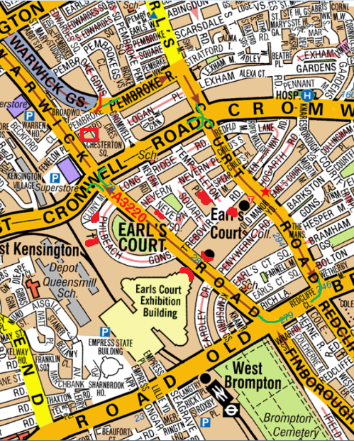 T/A - L Warwick road, R + R Nevern Square, L Trebovir road, R Earls Court road