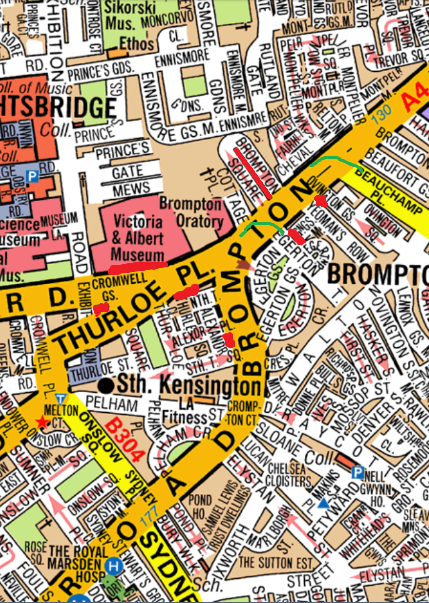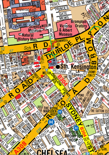 From South- Fulham road, North into Bute st R Harrington road SDOR