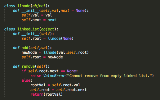 SWE: How do you implement a linked list in python, with add and remove methods?
