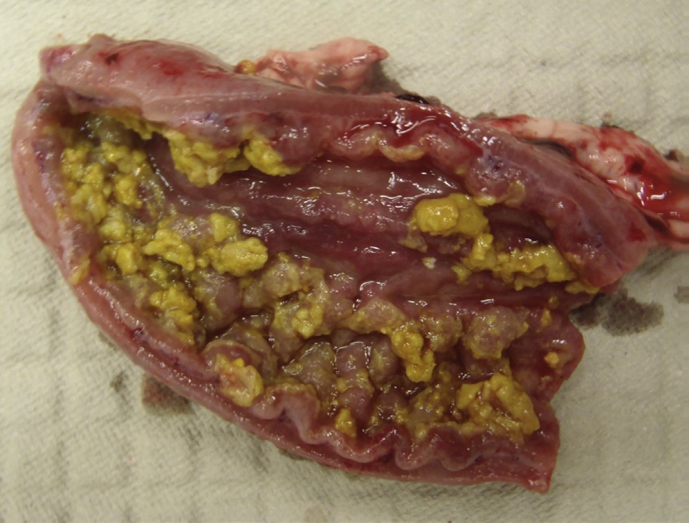 The intestine is diffusely thickened and there is fibrinonecrotic debris adherent to the lumenal surface