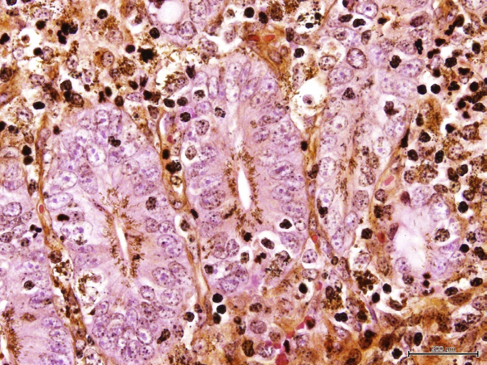 Lawsonia intracellularis, proliferative enteritis. Organisms are present within the apical cytoplasm of intestinal glandular enterocytes.