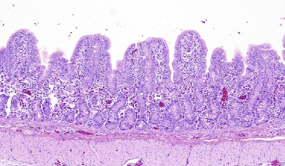 Villi of the small intestine are markedly shortened.