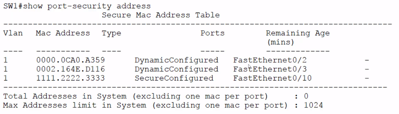 SW1# show port-security address
