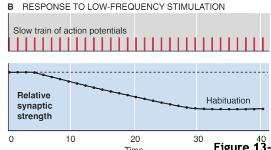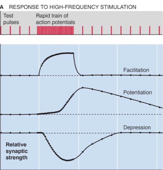 Depression: short term decreases - can occur diring high-frequency stimulation. - Weakened synapse that goes back to normal.