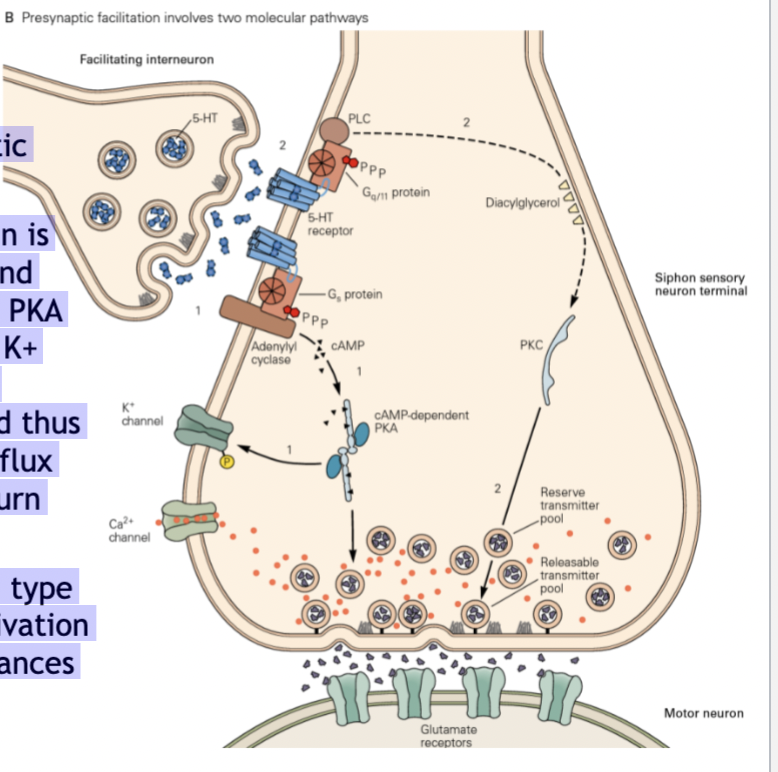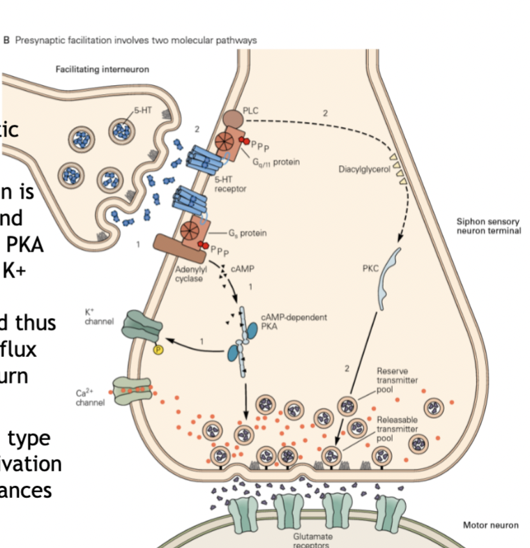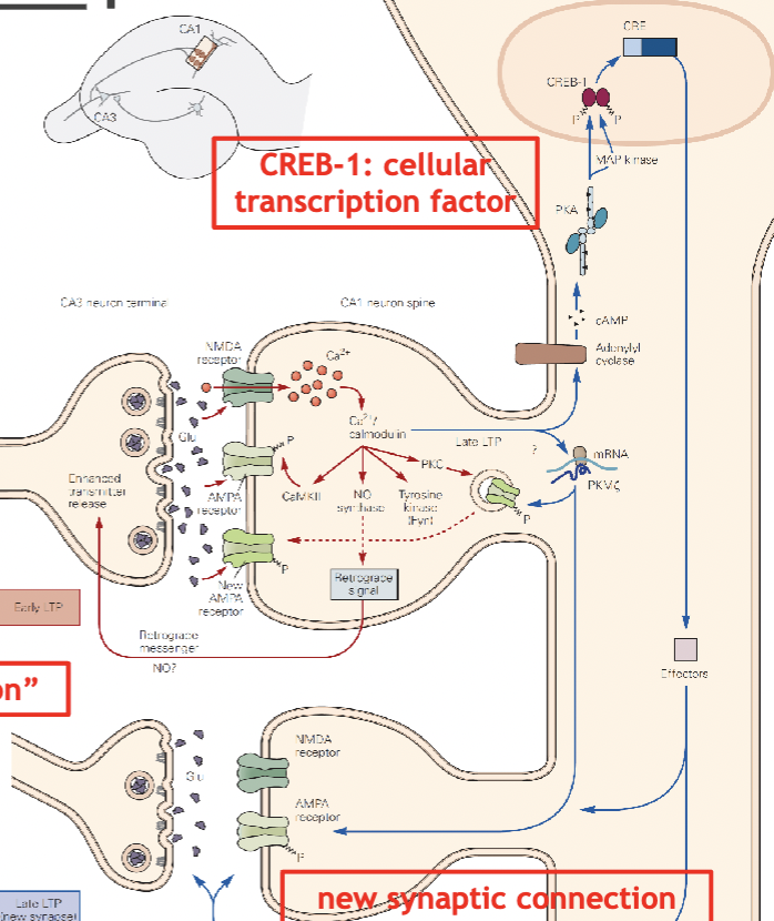 New Synaptic Connection: Repeated Potentials —> Ca influx —> Recruits Adenyl Cyclase —> Generates cAMP —> activates PKA —-> Activates MAP Kinase —> goes to nucleus and phosphorylates CREB 1 —> Activates CRE Promoter –> Leads to growth of new synapses.