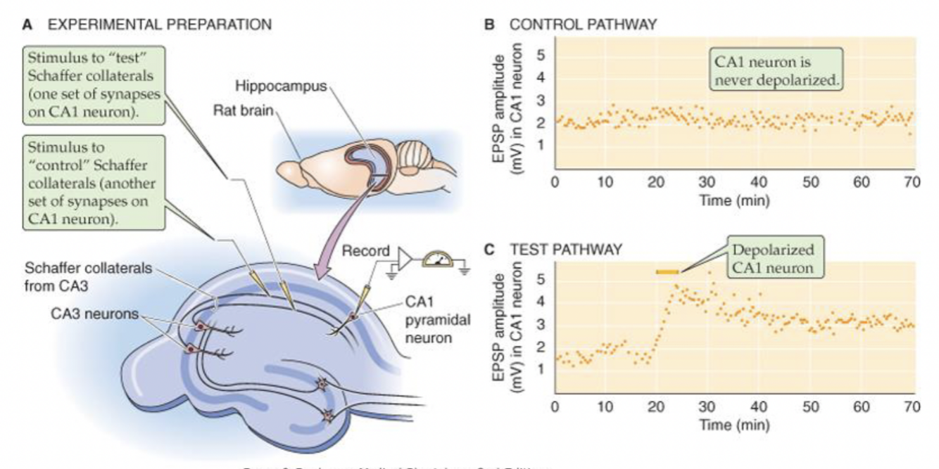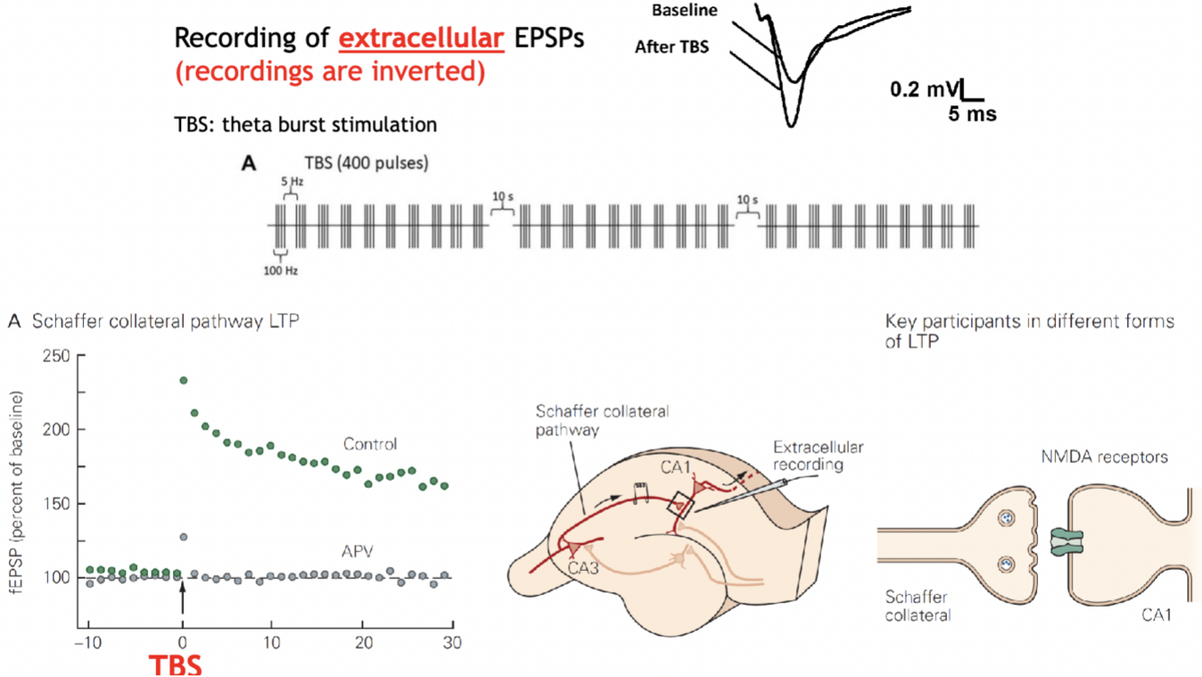 Theta Burst Stimulation (TBS) at the CA3 Neuron induces LTP and increases EPSP in CA1. - Requires NMDA receptors for LTP.
