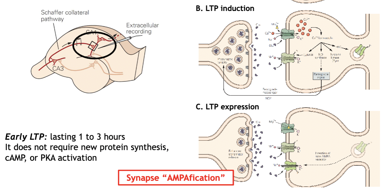 Early LTP: Lasts 1-3 hours and does not require new protein syntheses, cAMP or PKA activation.