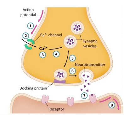 5) Neurotransmitter attaches to receptor site on post-synaptic neuron