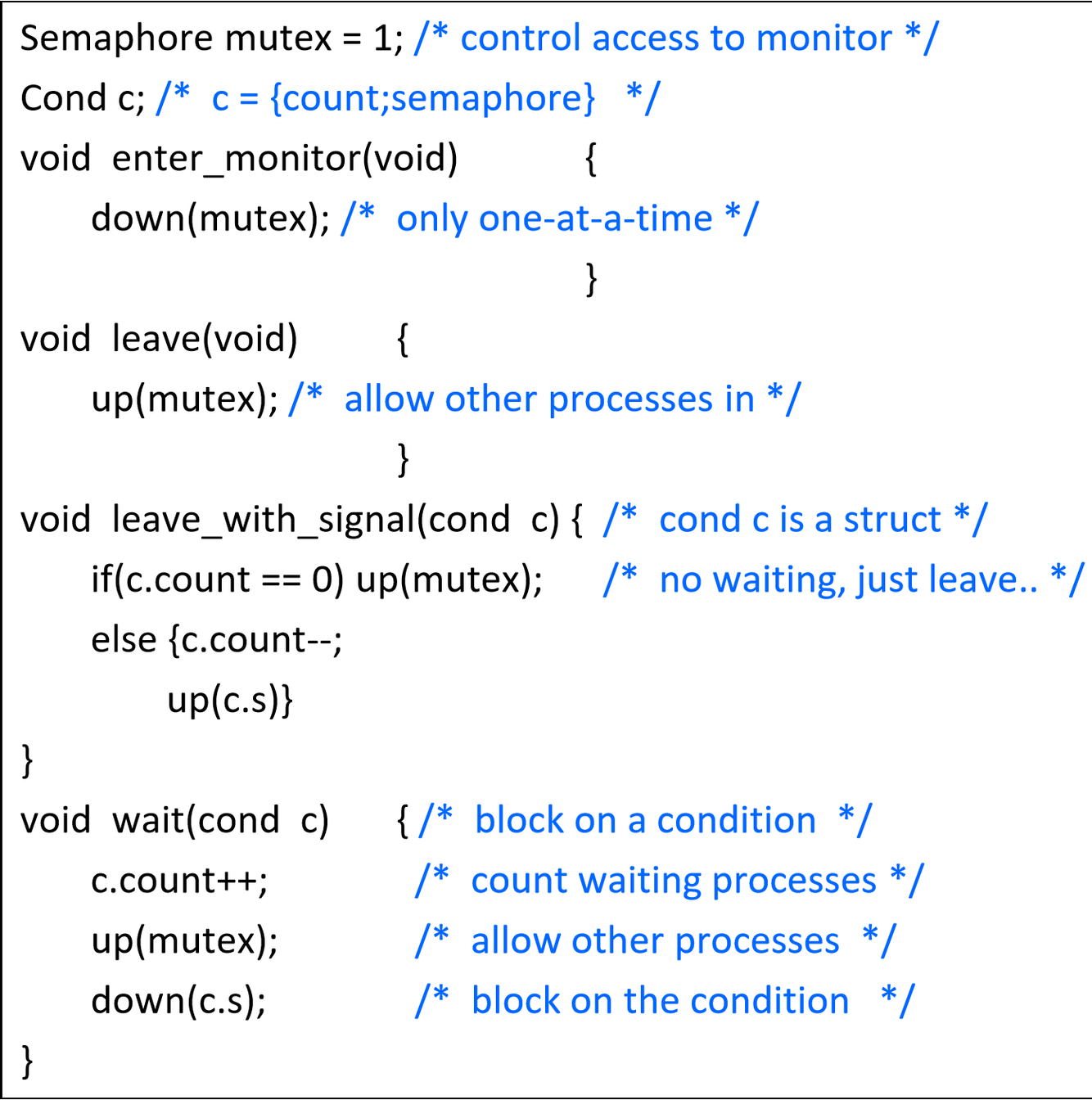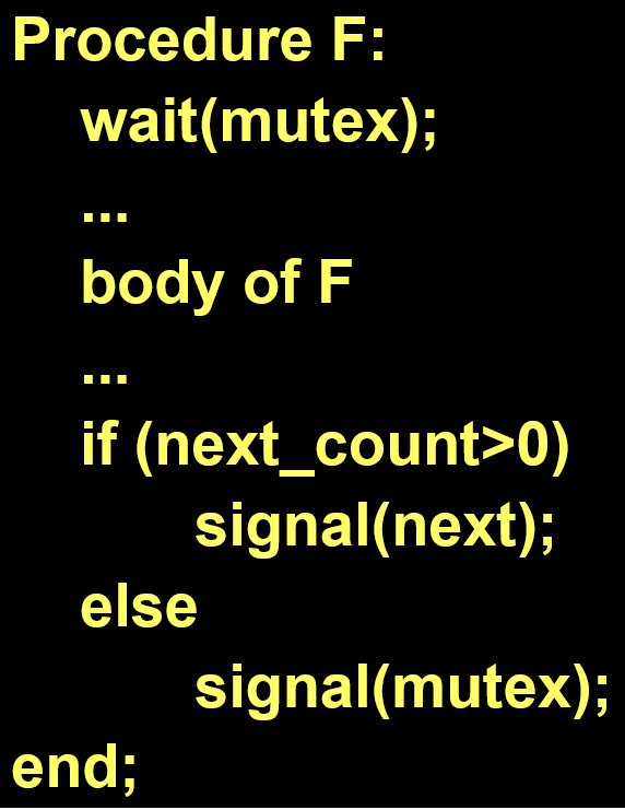 The monitor “compiler” has to automatically insert this code into compiled procedures(in Java the keyword “synchronized” makes that happen):