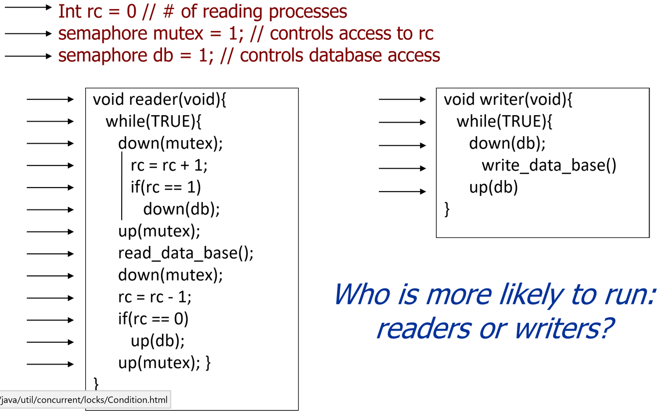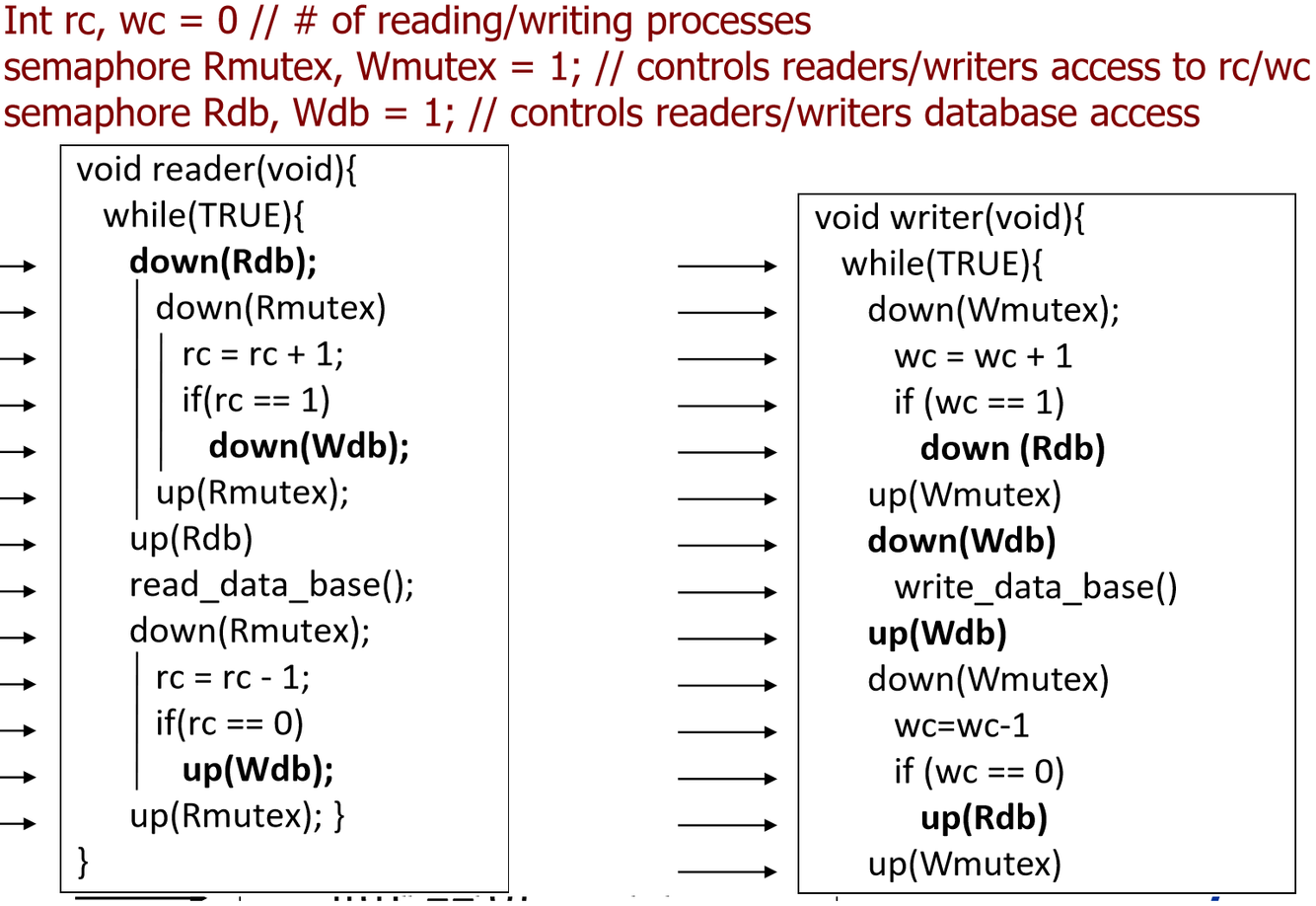 When multi readers try to read, a writer may suffer from starvation. If a reader captures the database, it is released only when the last reader finishes to read. A simple solution would be that no writer is kept waiting once it is “ready”.