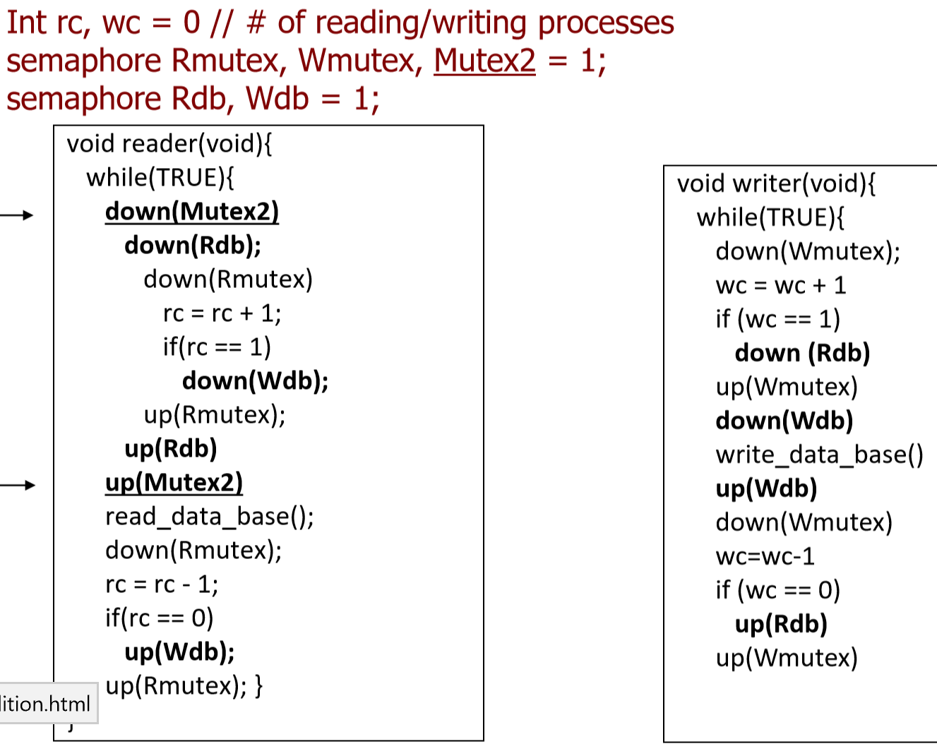 We use a simple and efficient tool; we wrap the Rdb mutex with mutex2. This way, if new readers and a writer arrive at the time when some reader is within the gap of down(Rdb) and up(Rdb), all new readers wait on mutex2 while the writer waits on Rdb. The writer is released first and then some reader will be waiting on Rdb while the rest of the readers are still waiting on mutex2. In total, a writer might wait to at most one reader to finish reading before it enters the CS.