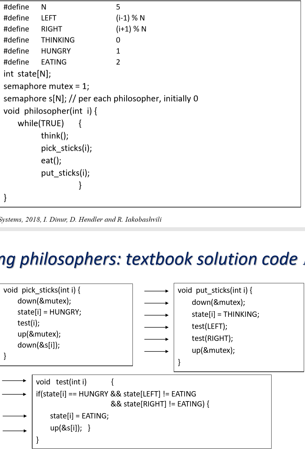 We saw it can be simply solved using a general mutex. when someone wants to eat, AKA, takes his two forks, he must first own the mutex. when he wants to release the forks, he must first own the mutex, and then check whether his collegues to his left and right wait for one of his forks. if so, he alarms them.