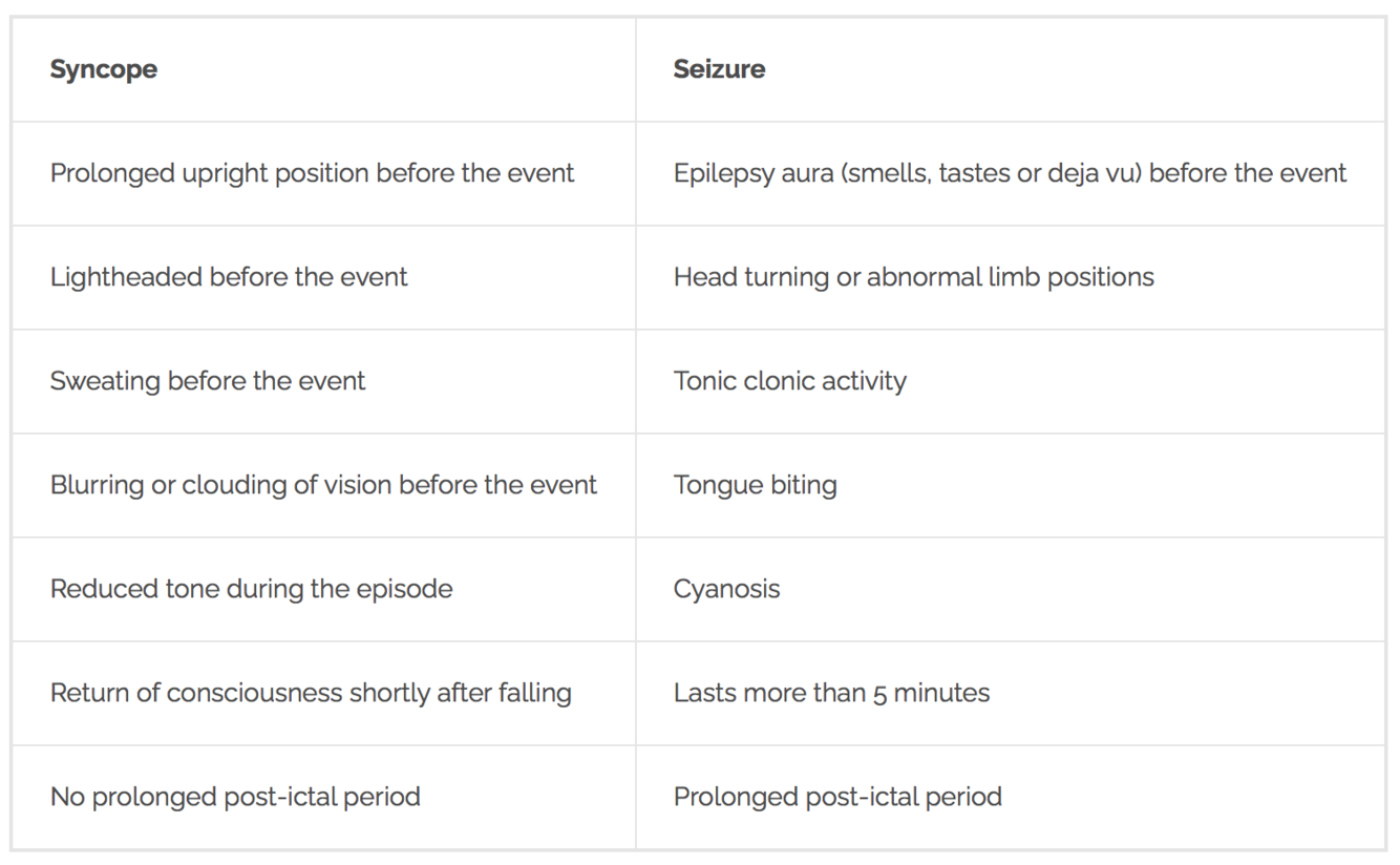 List 6 comparisons of a syncope episode vs a seizure