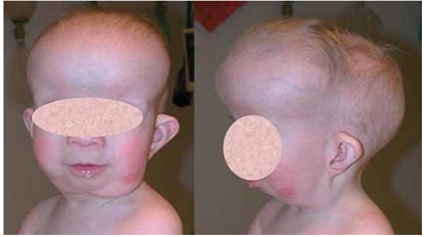 Characteristic clinical features of the cri du chat syndrome are growth and mental retardation, muscle hypotonia, micrognathia and retrognathia, low-set ears, moon facies, oblique palpebral fissures with anti-mongoloid slants, and hypertelorism (Fig. 2), associated with a strange high-pitched plaintive cry reminiscent of the mewing of a distressed kitten (2,4–6,8–10). This “cat’s cry” is considered by most pediatricians to be diagnostic and is probably due to the immature larynx and epiglottis present in these children (13). Although the character of the cry changes as the child matures, it remains distinctly abnormal (12). Sound spectrograms will continue to show a high fundamental tone (14). The cry is so characteristic that physicians familiar with this syndrome have made the correct diagnosis from sound recordings without ever having seen the patient.