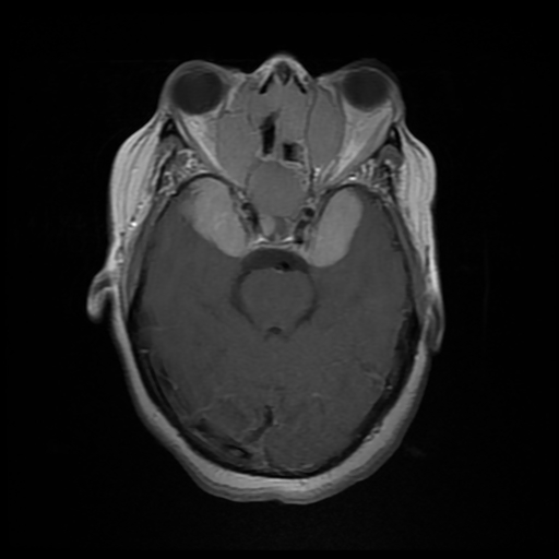 Large amount of contiguous well defined enhancing tissue in the paranasal sinuses, nasal cavity and adjacent to the greater wing of sphenoids.