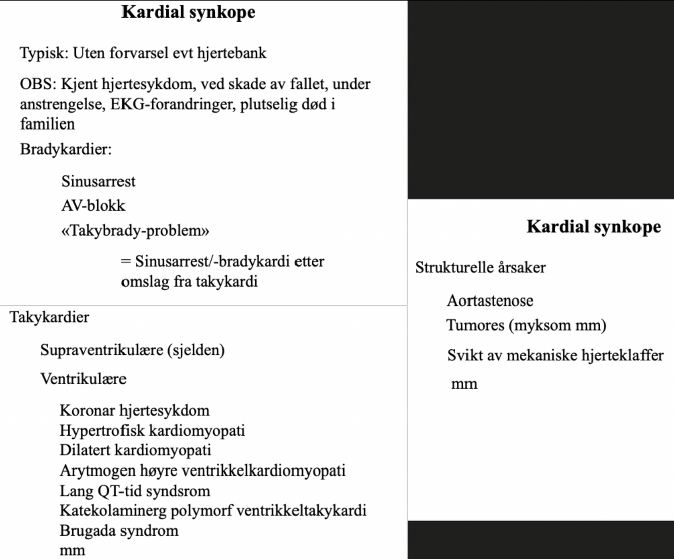 Hva kjennetegner kardial synkope, og hvilke underliggende årsaker er aktuelle?