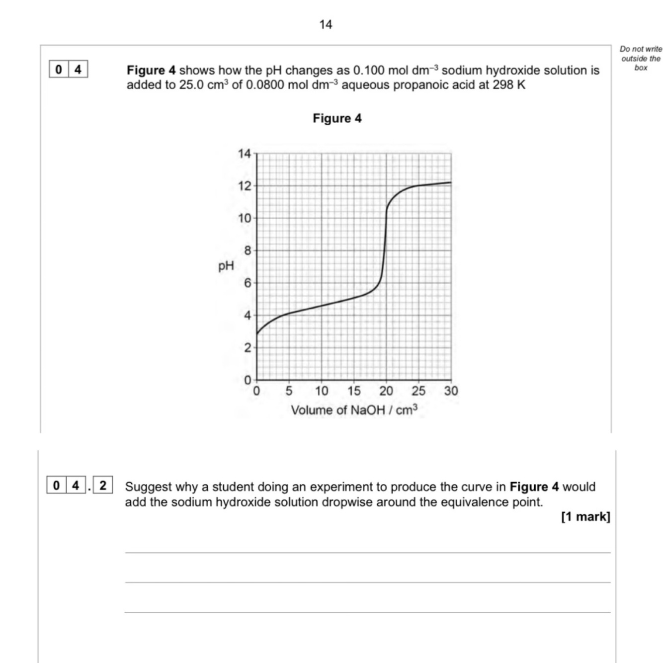 • When sodium hydroxide solution is added to aqueous propanoic acid, the solution formed acts as a buffer when between 5 cm? and 15 cmg have been added.