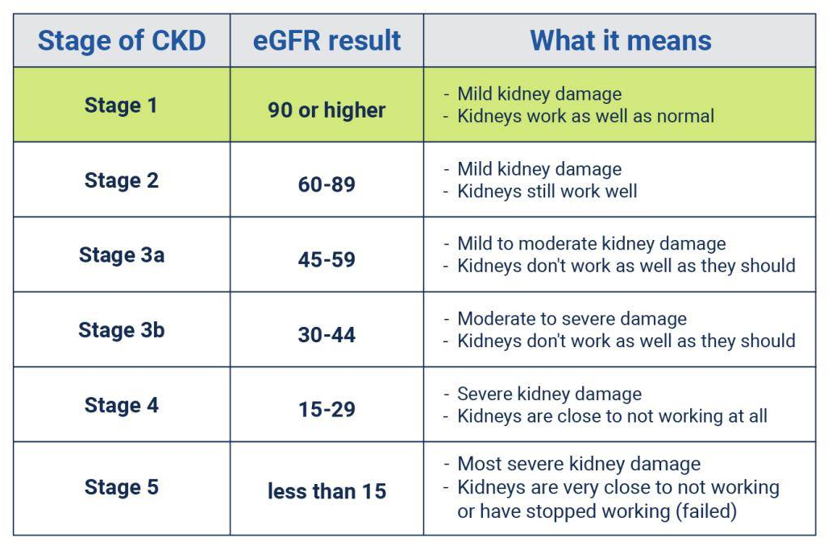 What are the different stages of CKD, their eGFR results and what this means?