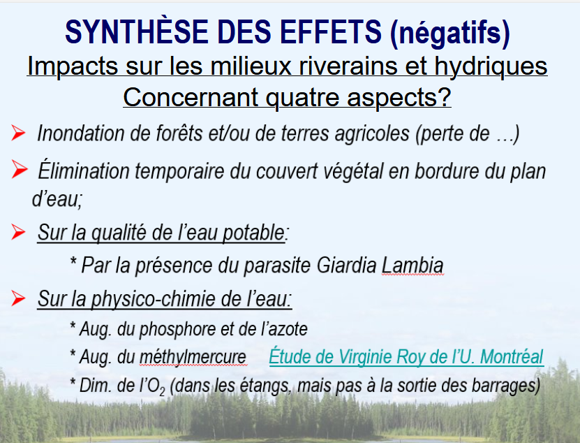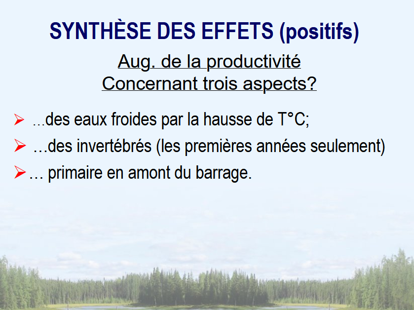 Réponse : Augmentation de la demande biochimique en oxygène (DBO) (due à une trop forte accumulation de la matière végétale morte s’accumulant au fond et décomposée par l’activité microbienne) qui aura pour effet de réduire le volume d’eau dans lequel peut vivre le touladi, en particulier dans les zones les plus profondes où se trouvent les juvéniles.