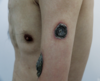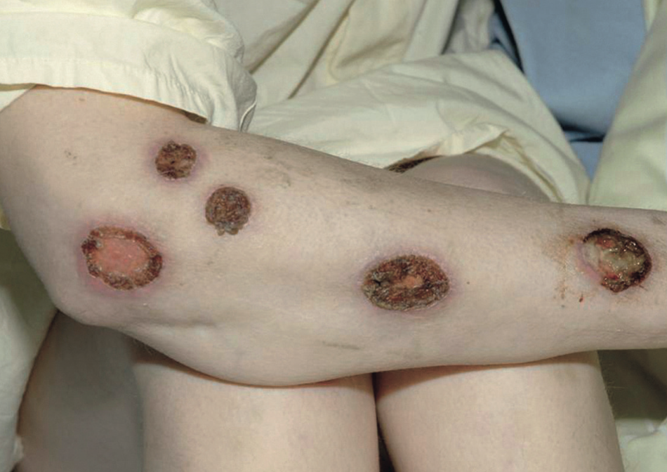 Plaques nécrotiques arrondies avec croutes rupioïdes lamellaires
