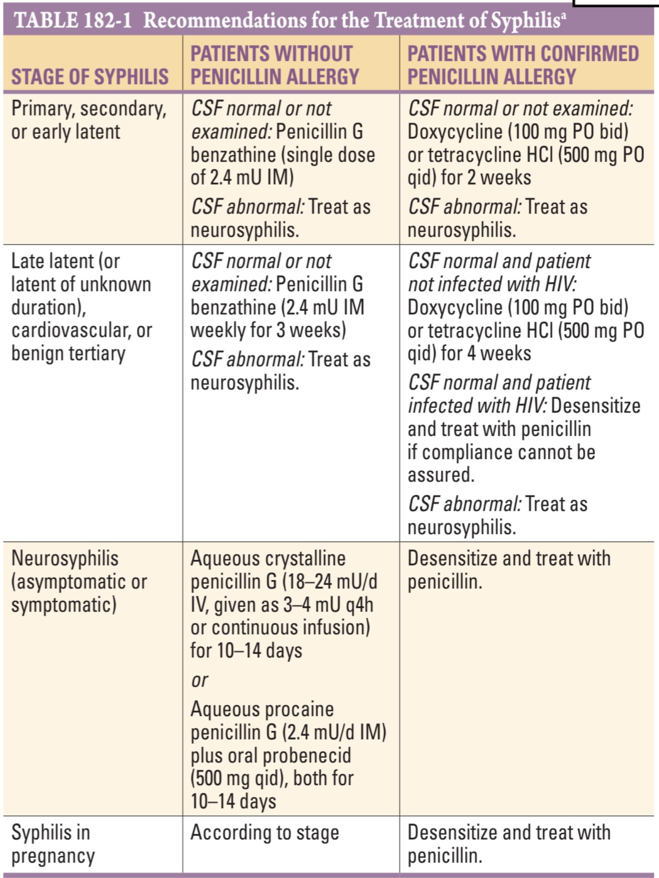 Efficacy of treatment should be assessed by clinical evaluation and monitoring of the quantitative VDRL or RPR titer for