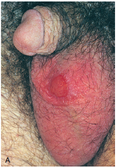 a painless, indurated chancre (aka hard chancre) (singular in males, multiple in women) appearing between 9-90 days (mean, 21 days) after infection at the point of spirochete entry. Systemic dissemination continues during this period, while the host immune system responds (this reponse does not fully clear the organism).