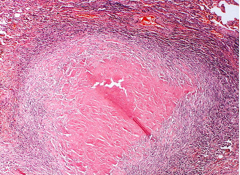 A Gumma marked by a central zone of coagulative necrosis surrounded by a mixed inflammatory infiltrate composed of lymphocytes, plasma cells, activated macrophages (epithelioid cells), occasional giant cells, and a peripheral zone of dense fibrous tissue.