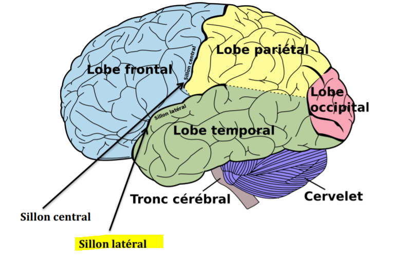 • lobe temporal (l’aire auditif primaire et l’aire de Wernicke du côté dominant